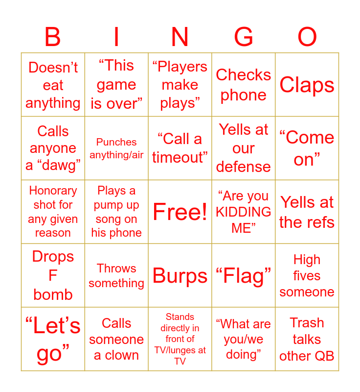 This bingo card has a free space and 24 words: Throws something, Calls someone a clown, “Call a timeout”, “Let’s go”, Claps, Doesn’t eat anything, Calls anyone a “dawg”, “This game is over”, “Are you KIDDING ME”, Burps, Yells at our defense, Honorary shot for any given reason, “Flag”, High fives someone, Punches anything/air, “What are you/we doing”, Yells at the refs, “Players make plays”, “Come on”, Plays a pump up song on his phone, Trash talks other QB, Drops F bomb, Checks phone and Stands directly in front of TV/lunges at TV.