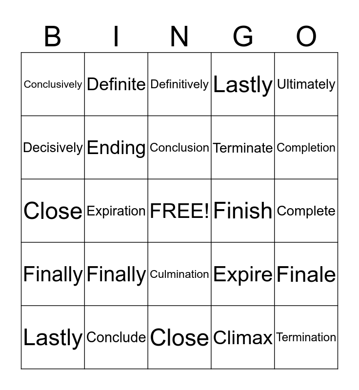 This bingo card has a free space and 24 words: Finally, Conclude, Conclusion, Lastly, Ultimately, Conclusively, Decisively, Definite, Finish, Culmination, Terminate, Close, Expire, Finale, Ending, Climax, Complete, Definitively, Completion, Expiration, Termination, Finally, Lastly and Close.