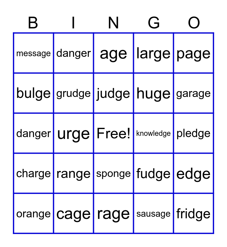 This bingo card has a free space and 24 words: range, cage, judge, orange, page, message, bulge, danger, knowledge, sponge, huge, danger, fudge, edge, grudge, sausage, pledge, age, garage, urge, fridge, charge, large and rage.