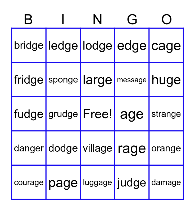 This bingo card has a free space and 24 words: dodge, page, large, courage, cage, bridge, fridge, ledge, age, village, message, fudge, rage, orange, sponge, judge, strange, lodge, huge, grudge, damage, danger, edge and luggage.