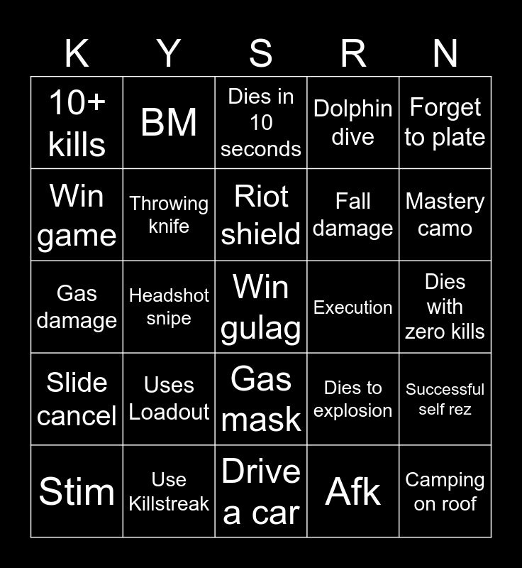 This bingo card has a free space and 24 words: Uses Loadout, Use Killstreak, Riot shield, Stim, Forget to plate, 10+ kills, Win game, BM, Execution, Gas mask, Fall damage, Gas damage, Dies to explosion, Successful self rez, Throwing knife, Afk, Dies with zero kills, Dies in 10 seconds, Mastery camo, Headshot snipe, Camping on roof, Slide cancel, Dolphin dive and Drive a car.