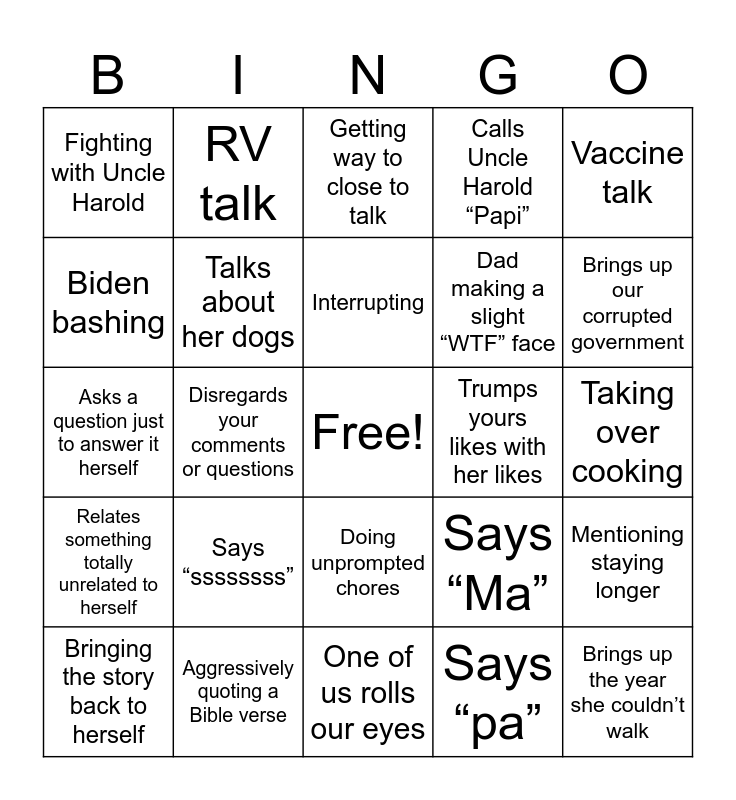 This bingo card has a free space and 24 words: Says “ssssssss”, Aggressively quoting a Bible verse, Interrupting, Bringing the story back to herself, Vaccine talk, Fighting with Uncle Harold, Biden bashing, RV talk, Trumps yours likes with her likes, Doing unprompted chores, Dad making a slight “WTF” face, Asks a question just to answer it herself, Says “Ma”, Mentioning staying longer, Talks about her dogs, Says “pa”, Taking over cooking, Getting way to close to talk, Brings up our corrupted government, Disregards your comments or questions, Brings up the year she couldn’t walk, Relates something totally unrelated to herself, Calls Uncle Harold “Papi” and One of us rolls our eyes.