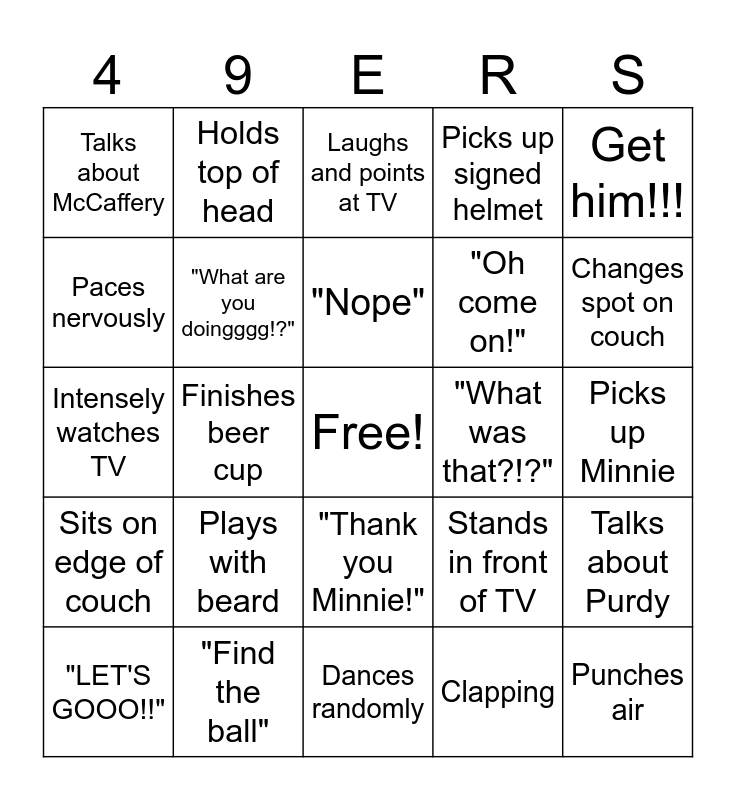 This bingo card has a free space and 24 words: Plays with beard, "Find the ball", "Nope", "LET'S GOOO!!", Get him!!!, Talks about McCaffery, Paces nervously, Holds top of head, "What was that?!?", "Thank you Minnie!", "Oh come on!", Intensely watches TV, Stands in front of TV, Talks about Purdy, "What are you doingggg!?", Clapping, Picks up Minnie, Laughs and points at TV, Changes spot on couch, Finishes beer cup, Punches air, Sits on edge of couch, Picks up signed helmet and Dances randomly.
