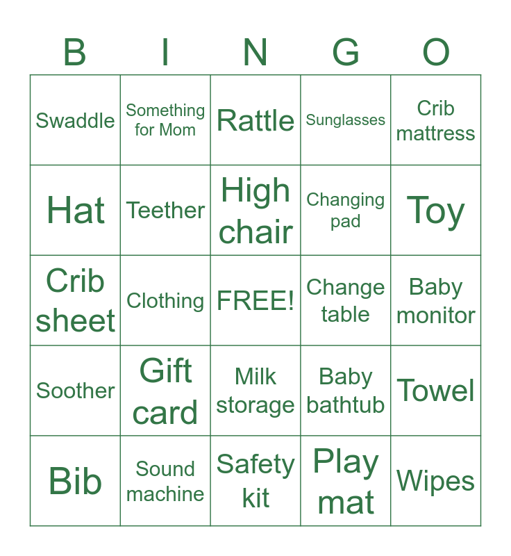This bingo card has a free space and 29 words: Bib, Diapers, Clothing, Bottle, Swaddle, Rattle, Teether, Gift card, Change table, Sound machine, Baby monitor, Wipes, Safety kit, Play mat, Toy, Breast pump, Milk storage, Soother, Crib mattress, Crib sheet, Baby bathtub, Baby carrier, Changing pad, Hat, Sunglasses, Something for Mom, Towel, High chair and Baby gate.