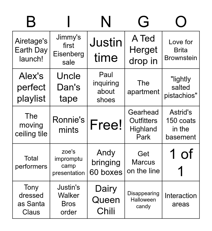 This bingo card has a free space and 24 words: zoe's impromptu camp presentation, Justin's Walker Bros order, Paul inquiring about shoes, Tony dressed as Santa Claus, Love for Brita Brownstein, Airetage's Earth Day launch!, Alex's perfect playlist, Jimmy's first Eisenberg sale, Gearhead Outfitters Highland Park, Andy bringing 60 boxes, The apartment, The moving ceiling tile, Get Marcus on the line, 1 of 1, Uncle Dan's tape, Disappearing Halloween candy, Astrid's 150 coats in the basement, Justin time, "lightly salted pistachios", Ronnie's mints, Interaction areas, Total performers, A Ted Herget drop in and Dairy Queen Chili.