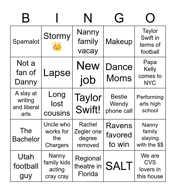 This bingo card has a free space and 24 words: Uncle who works for the Chargers, Nanny family kids acting cray cray, New job, Utah football guy, Taylor Swift in terms of football, Spamalot, Not a fan of Danny, Stormy 👑, Bestie Wendy phone call, Rachel Zegler one degree removed, Dance Moms, A slay at writing and liberal arts, Ravens favored to win, Nanny family slaying with the $$, Lapse, SALT, Performing arts high school, Nanny family vacay, Papa Kelly comes to NYC, Long lost cousins, We are CVS lovers in this house, The Bachelor, Makeup and Regional theatre in Florida.