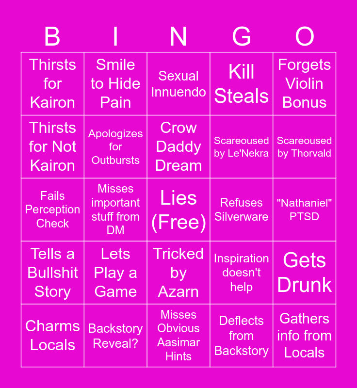 This bingo card has a free space and 24 words: Lets Play a Game, Backstory Reveal?, Crow Daddy Dream, Charms Locals, Forgets Violin Bonus, Thirsts for Kairon, Thirsts for Not Kairon, Smile to Hide Pain, Refuses Silverware, Tricked by Azarn, Scareoused by Le'Nekra, Fails Perception Check, Inspiration doesn't help, Gets Drunk, Apologizes for Outbursts, Deflects from Backstory, "Nathaniel" PTSD, Sexual Innuendo, Scareoused by Thorvald, Misses important stuff from DM, Gathers info from Locals, Tells a Bullshit Story, Kill Steals and Misses Obvious Aasimar Hints.