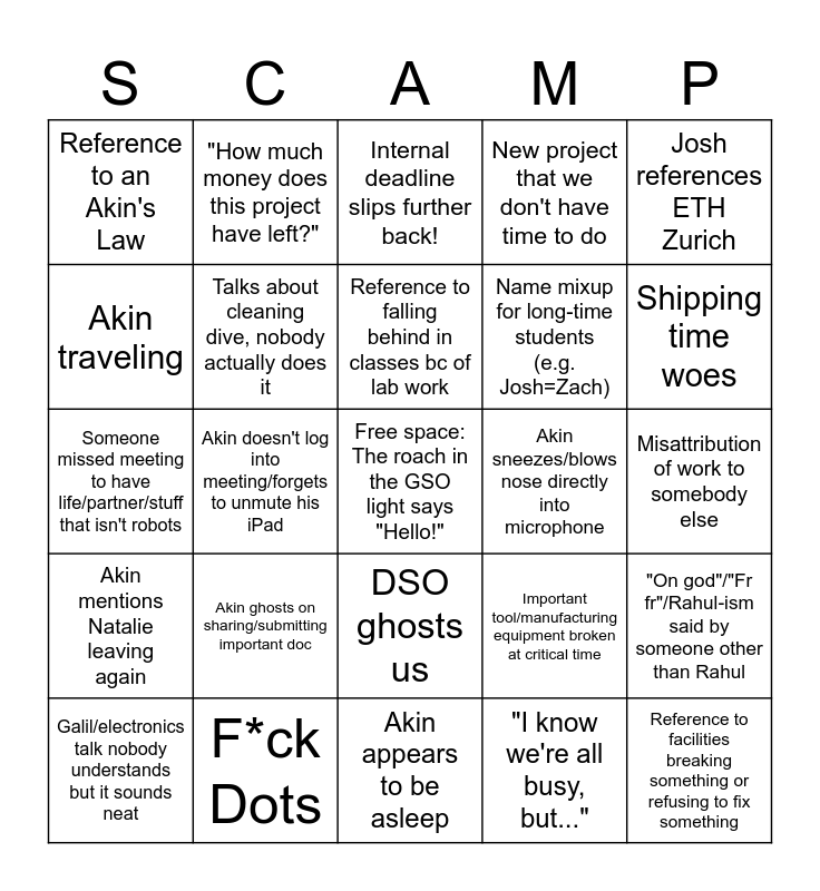 This bingo card has a free space and 57 words: "We need to get [this project we're all working overtime on] done by [deadline we all know]", Galil/electronics talk nobody understands but it sounds neat, Someone actually says "no" to a harebrained project idea, Reference to an Akin's Law, Akin appears to be asleep, Passive-aggressive shaming of lack of progress, Talks about cleaning dive, nobody actually does it, Relevant undergrad mysteriously absent, Name mixup for long-time students (e.g. Josh=Zach), Issue with the pool this week, New project that we don't have time to do, Lab maintenance talk takes longer than projects, Romeo is a stealth Inca Kola marketer, Awkward pause as we're done talking but Akin hasn't decided if the topic is over yet, New undergrad abandons project, Truancy!, Josh references ETH Zurich, Akin doesn't log into meeting/forgets to unmute his iPad, Someone names a random part number that they absolutely should not know from memory, Reference to facilities breaking something or refusing to fix something, Akin sneezes/blows nose directly into microphone, Romeo apologizes, Important tool/manufacturing equipment broken at critical time, Internal deadline slips further back!, Reference to/request for no-cost extension, Reference to falling behind in classes bc of lab work, Someone jumps from the loud squeaking from the ventilation in the meeting room, ML/neural network joke, Shipping time woes, Somebody did an all-nighter in the shop again, Storytime with Dave!, Mention of old lab member who graduated before anyone else arrived, Mysterious cross-project reallocation of $$$, Akin swears!, Misattribution of work to somebody else, Akin traveling, Someone working even while """on vacation""", Someone missed meeting to have life/partner/stuff that isn't robots, somebody's horribly sick but still called in!, Akin mentions Natalie leaving again, "How much money does this project have left?", DSO ghosts us, Rahul is too good at software, Dave starts a second Teams meeting despite another Teams meeting already existing, [Project] has no money and no formal extension but we're doing it anyway!, Unreasonable/weird DSO request, Akin ghosts on sharing/submitting important doc, F*ck Dots, Akin-dependent job in critical path (rec letter, etc.) not done, Proposing name for new project, Reference to falling behind in lab work because of classes, "I know we're all busy, but...", Very last minute transfer of paper/proposal to grad students, Akin remembers that Josh is a student here (tours don't count), Oh no we've acquired more 2nd/3rd/Nth-hand junk, "On god"/"Fr fr"/Rahul-ism said by someone other than Rahul and The Aero office messes up. Probably Dana.