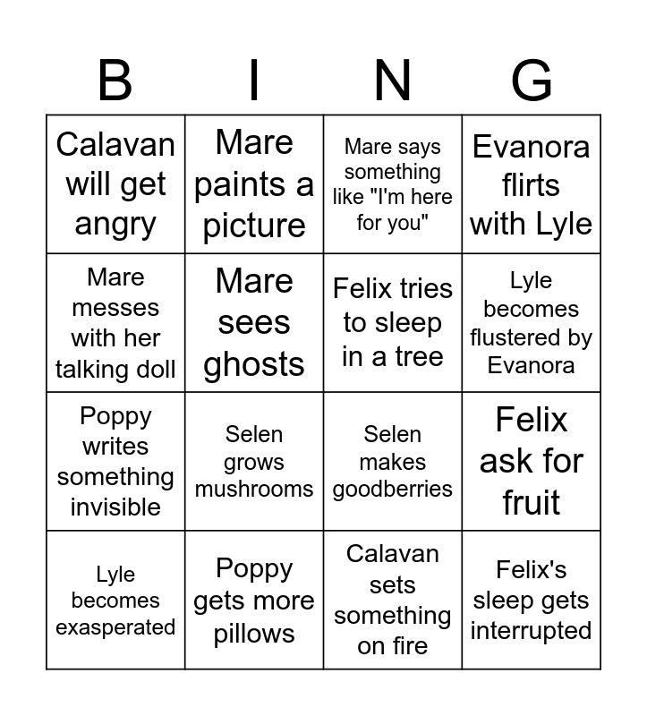 This bingo card has 16 words: Poppy gets more pillows, Felix ask for fruit, Mare says something like "I'm here for you", Calavan will get angry, Poppy writes something invisible, Mare paints a picture, Selen makes goodberries, Calavan sets something on fire, Mare messes with her talking doll, Mare sees ghosts, Lyle becomes exasperated, Evanora flirts with Lyle, Selen grows mushrooms, Lyle becomes flustered by Evanora, Felix tries to sleep in a tree and Felix's sleep gets interrupted.