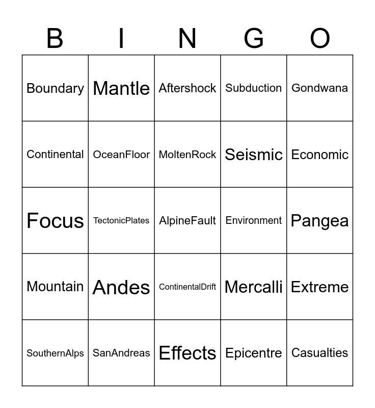 This bingo card has 65 words: InnerCore, OuterCore, CivilDefence, Extreme, Hazard, Crust, Mantle, Core, MoltenRock, Magma, ContinentalDrift, Supercontinent, Pangea, Gondwana, Oceanic, Continental, TectonicPlates, Boundary, TransformBoundary, Seismic, Andes, Mountain, Subduction, Fault, Crack, Movement, Napier, City, AlpineFault, NewZealand, SouthernAlps, Landform, Richter, Magnitude, Mercalli, SanAndreas, Seismologist, Focus, Epicentre, SeismicWaves, OceanFloor, Cultural, Environment, Damage, Liquefaction, Effect, Economic, FirstAid, Casualties, FixFastenForget, Prepare, Property, Tsunami, Effects, Insurance, BaseIsolators, Houses, Aftershock, Plates, IndoAustralian, Pacific, Survival, Emergency, PacificRingFire and Continents.