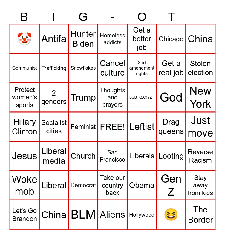 This bingo card has a free space and 48 words: Jesus, Socialist cities, BLM, San Francisco, 2nd amendment rights, Drag queens, China, Let's Go Brandon, 2 genders, Feminist, Homeless addicts, Get a better job, God, New York, Hillary Clinton, Liberal, Hunter Biden, Thoughts and prayers, Obama, Chicago, Stolen election, Communist, Antifa, Snowflakes, Hollywood, Get a real job, Just move, Woke mob, Liberal media, Trump, Take our country back, LGBTQAXYZ+, Gen Z, Stay away from kids, 🤡, China, Church, Aliens, Leftist, 😆, Reverse Racism, Protect women's sports, Trafficking, Democrat, Cancel culture, Liberals, Looting and The Border.