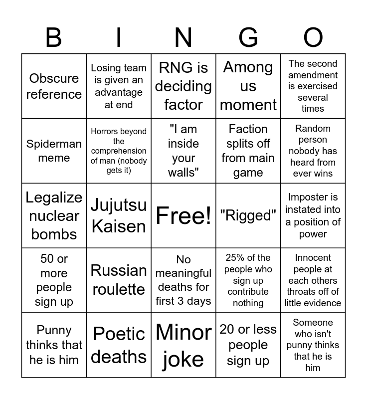 This bingo card has a free space and 24 words: Russian roulette, Poetic deaths, "I am inside your walls", Punny thinks that he is him, The second amendment is exercised several times, Obscure reference, Spiderman meme, Losing team is given an advantage at end, "Rigged", No meaningful deaths for first 3 days, Faction splits off from main game, Legalize nuclear bombs, 25% of the people who sign up contribute nothing, Innocent people at each others throats off of little evidence, Horrors beyond the comprehension of man (nobody gets it), 20 or less people sign up, Imposter is instated into a position of power, RNG is deciding factor, Random person nobody has heard from ever wins, Jujutsu Kaisen, Someone who isn't punny thinks that he is him, 50 or more people sign up, Among us moment and Minor joke.