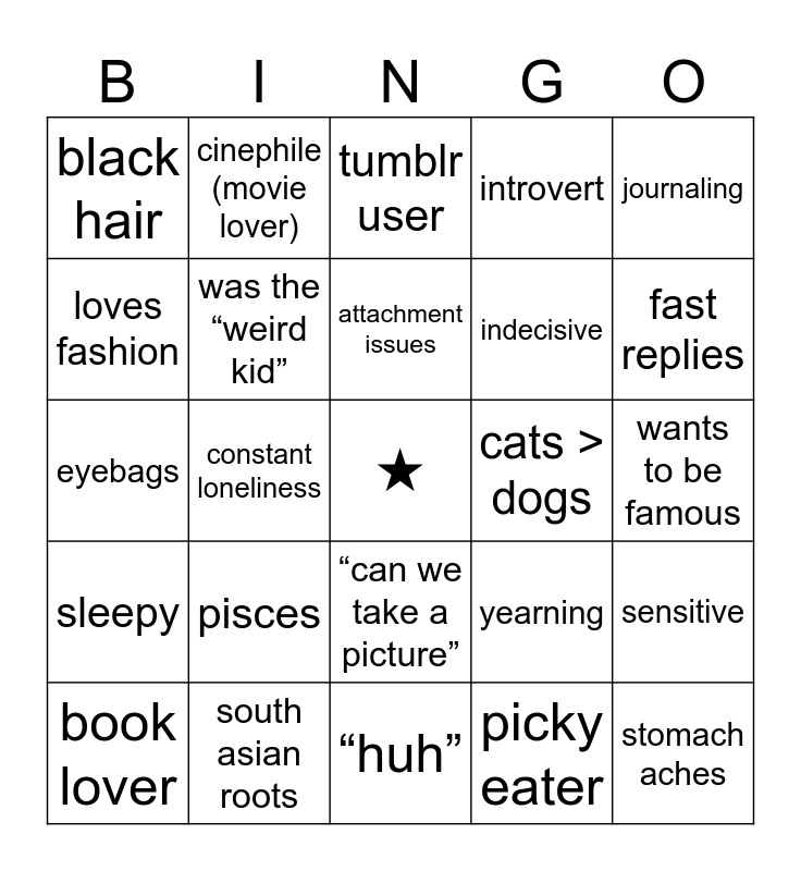 This bingo card has a free space and 24 words: pisces, south asian roots, attachment issues, book lover, journaling, black hair, loves fashion, cinephile (movie lover), cats > dogs, “can we take a picture”, indecisive, eyebags, yearning, sensitive, was the “weird kid”, picky eater, wants to be famous, tumblr user, fast replies, constant loneliness, stomach aches, sleepy, introvert and “huh”.