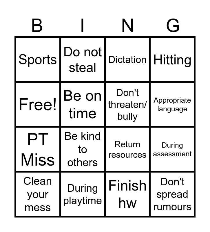This bingo card has 16 words: During playtime, During assessment, Dictation, Sports, PT Miss, Do not steal, Return resources, Finish hw, Free!, Be on time, Clean your mess, Hitting, Be kind to others, Appropriate language, Don't threaten/ bully and Don't spread rumours.