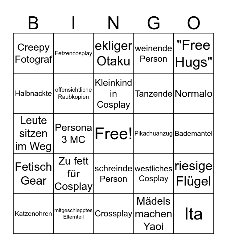 This bingo card has a free space and 24 words: Zu fett für Cosplay, mitgeschlepptes Elternteil, Kleinkind in Cosplay, Katzenohren, "Free Hugs", Creepy Fotograf, Halbnackte, Fetzencosplay, Pikachuanzug, schreinde Person, Tanzende, Leute sitzen im Weg, westliches Cosplay, riesige Flügel, offensichtliche Raubkopien, Mädels machen Yaoi, Bademantel, ekliger Otaku, Normalo, Persona 3 MC, Ita, Fetisch Gear, weinende Person and Crossplay.