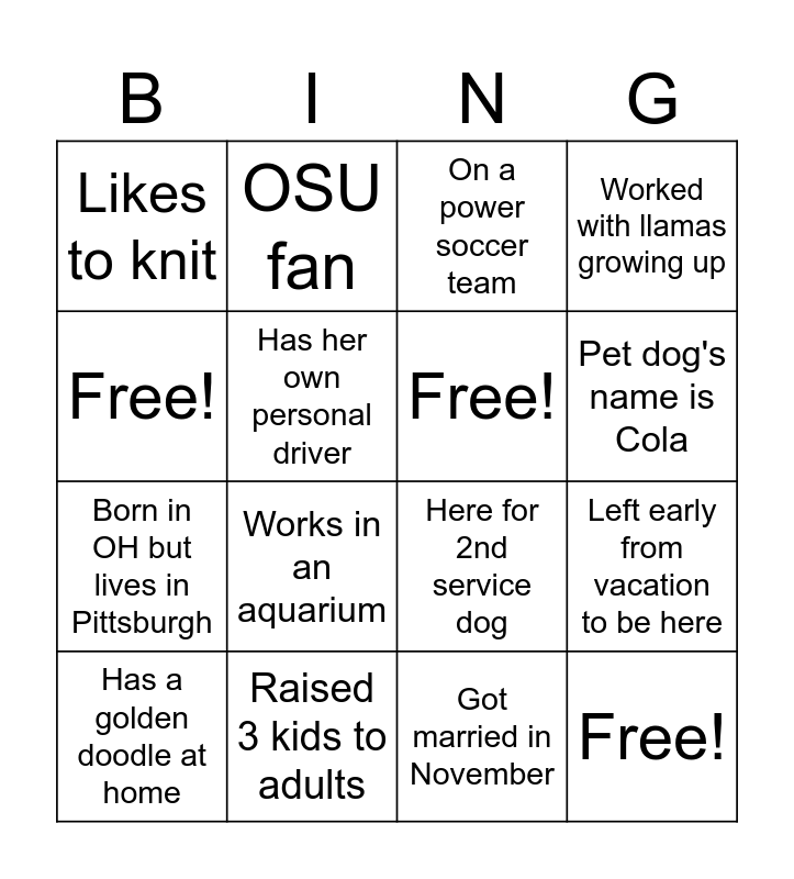 This bingo card has 16 words: Raised 3 kids to adults, Left early from vacation to be here, On a power soccer team, Likes to knit, Born in OH but lives in Pittsburgh, OSU fan, Here for 2nd service dog, Got married in November, Free!, Has her own personal driver, Has a golden doodle at home, Worked with llamas growing up, Works in an aquarium, Pet dog's name is Cola, Free! and Free!.