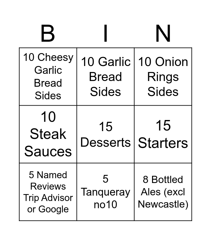 This bingo card has 9 words: 5 Named Reviews Trip Advisor or Google, 10 Onion Rings Sides, 10 Garlic Bread Sides, 10 Steak Sauces, 10 Cheesy Garlic Bread Sides, 15 Starters, 15 Desserts, 8 Bottled Ales (excl Newcastle) and 5 Tanqueray no10.