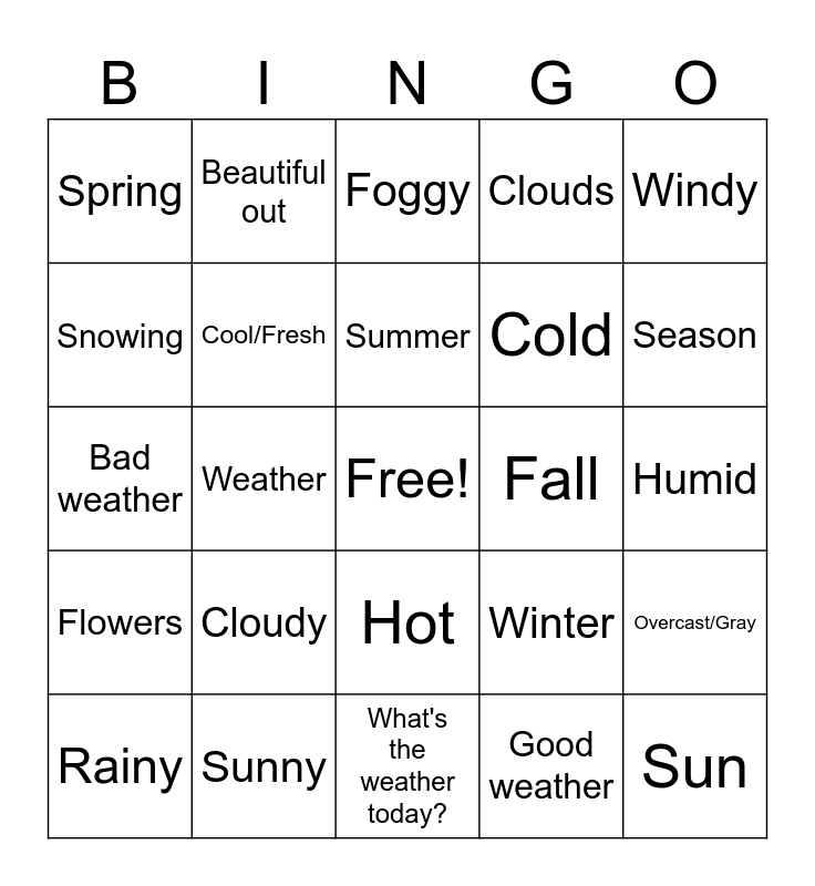 This bingo card has a free space and 24 words: Cloudy, Sunny, Summer, Rainy, Windy, Spring, Snowing, Beautiful out, Fall, Hot, Cold, Bad weather, Winter, Overcast/Gray, Cool/Fresh, Good weather, Humid, Foggy, Season, Weather, Sun, Flowers, Clouds and What's the weather today?.