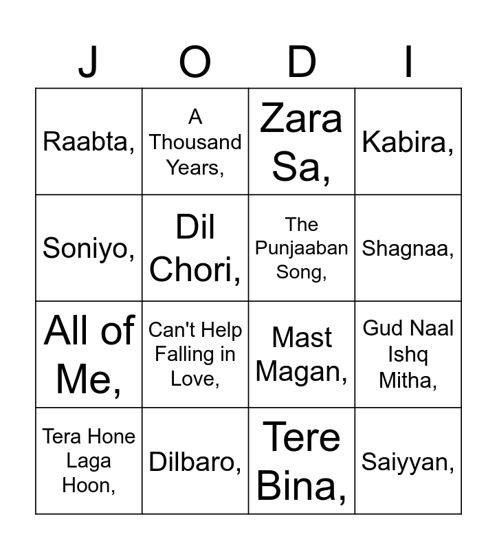 This bingo card has 52 words: Tujhe Kitna Chahne Lage,, Tera Hone Laga Hoon,, Mere Sohneya,, Phir Kabhi,, Saathiya,, Heeriye,, A Thousand Years,, Mahiye Jinna Sohna,, Dil Chori,, Tere Pyaar Mein,, The Punjaaban Song,, Tera Ban Jaunga,, Badri Ki Dulhaniya,, Abhi Mujh Mein Kahin,, Ranjha,, My Heart Will Go On,, Shagnaa,, Dilbaro,, I'm Yours,, Soniyo,, Gud Naal Ishq Mitha,, Tum Jo Aaye,, Raabta,, All of Me,, Chasing Cars,, Chashni,, Morni Banke,, Dekha Tenu,, Can't Help Falling in Love,, Pehli Nazar Mein,, Thinking Out Loud,, Kabira,, Maula Mere Maula,, Ainvayi Ainvayi,, Illahi,, Zara Sa,, Teri Deewani,, Shukran Allah,, Tum Tak,, Subha Hone Na De,, Bulleya,, Tere Bina,, Saiyyan,, Sajna Hai Mujhe Sajna Ke Liye,, Khamoshiyan,, Khairiyat,, Humdard,, Mast Magan,, Raatan Lambiyan,, Apna Bana Le,, Kesariya, and Marry You.