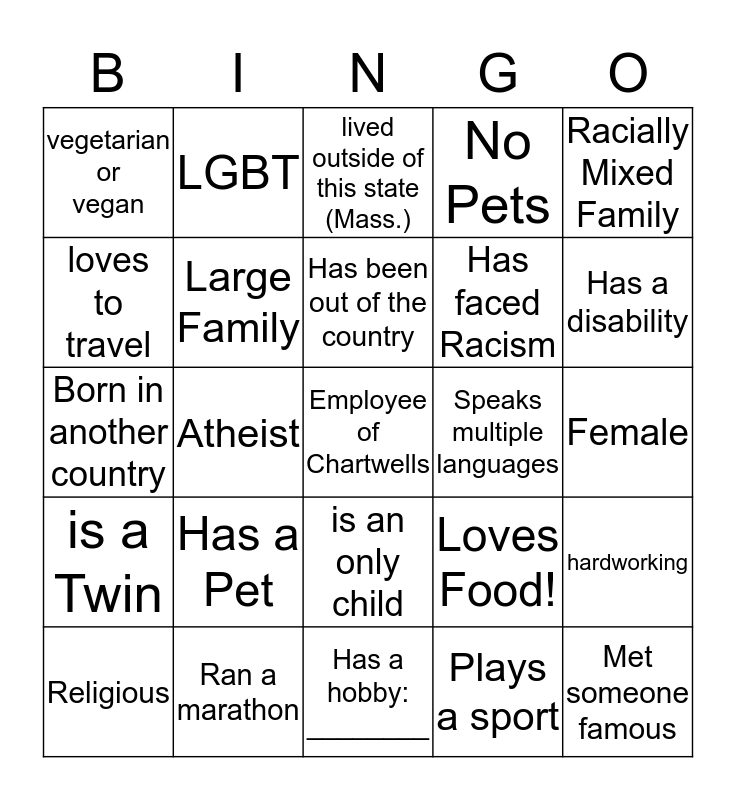 This bingo card has a free space and 24 words: Has a Pet, Ran a marathon, Has been out of the country, Religious, Racially Mixed Family, vegetarian or vegan, loves to travel, LGBT, Speaks multiple languages, is an only child, Has faced Racism, Born in another country, Loves Food!, hardworking, Large Family, Plays a sport, Female, lived outside of this state (Mass.), Has a disability, Atheist, Met someone famous, is a Twin, No Pets and Has a hobby: ________.