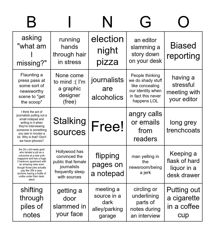 This bingo card has a free space and 38 words: That all journalists drink coffee!!, Wearing a fedora with a piece of paper reading press, old typewriters, None come to mind :( I'm a graphic designer (free), Keeping a flask of hard liquor in a desk drawer, Hollywood has convinced the public that female journalists frequently sleep with sources, journalists are alcoholics, Journalists are neurotic, Biased reporting, People thinking we do shady stuff like concealing our identity when in fact this never happens LOL, Stalking sources, an editor slamming a story down on your desk, Putting out a cigarette in a coffee cup, long grey trenchcoats, Flaunting a press pass at some sort of newsworthy scene to "get the scoop", the 24 y old newly grad who landed a job as a columnist at a new york magazine and has a huge 3 bedroom apartment with an amazing view even though those jobs actually pay like 30k a year, anchors having a bottle of vodka under their desk, electi, anchors having a bottle of vodka under their desk, election night pizza, election night pizza, or an old timey hat with a feather on it, angry calls or emails from readers, asking "what am I missing?", getting a door slammed in your face, having a stressful meeting with your editor, shifting through piles of notes, smoking in the newsroom, meeting a source in a dark alley/parking garage, getting a door slammed in your face, having a stressful meeting with your editor, shifting through piles of notes, agreeing to an off-the-record interview, wearing a trench coat and hat, flipping pages on a notepad, circling or underlining parts of notes during an interview, running hands through hair in stress, taking off glasses at table when a story falls through, man yelling in the newsroom/being a jerk, I think the act of journalists pulling out a small notepad and writing in it when they're interviewing someone is something you see in movies a lot. Why is that? Don't we have iphones? and agreeing to an off-the-record interview.