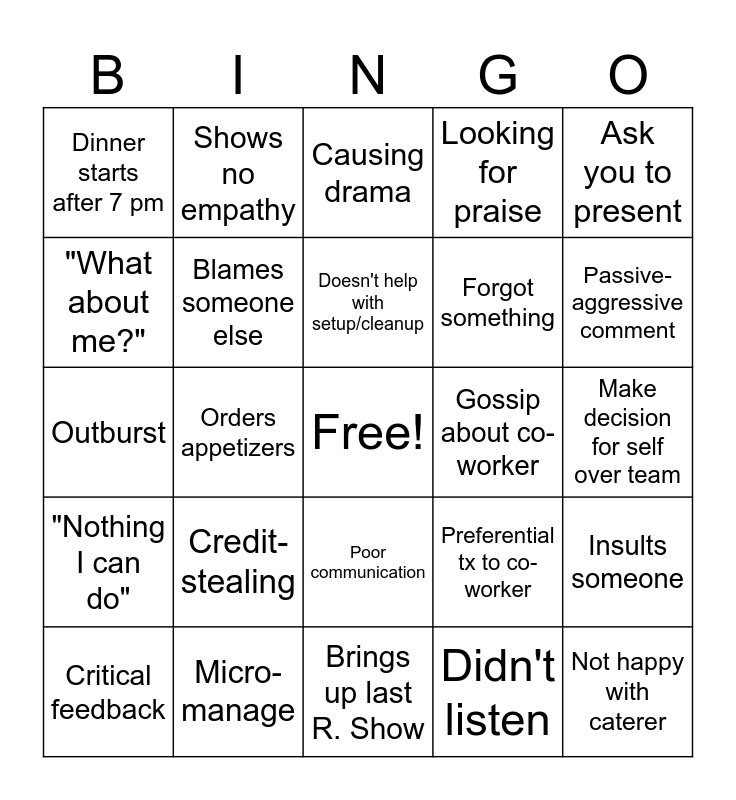 This bingo card has a free space and 24 words: Credit-stealing, Micro-manage, Doesn't help with setup/cleanup, Critical feedback, Ask you to present, Dinner starts after 7 pm, "What about me?", Shows no empathy, Gossip about co-worker, Poor communication, Forgot something, Outburst, Preferential tx to co-worker, Insults someone, Blames someone else, Didn't listen, Make decision for self over team, Causing drama, Passive-aggressive comment, Orders appetizers, Not happy with caterer, "Nothing I can do", Looking for praise and Brings up last R. Show.