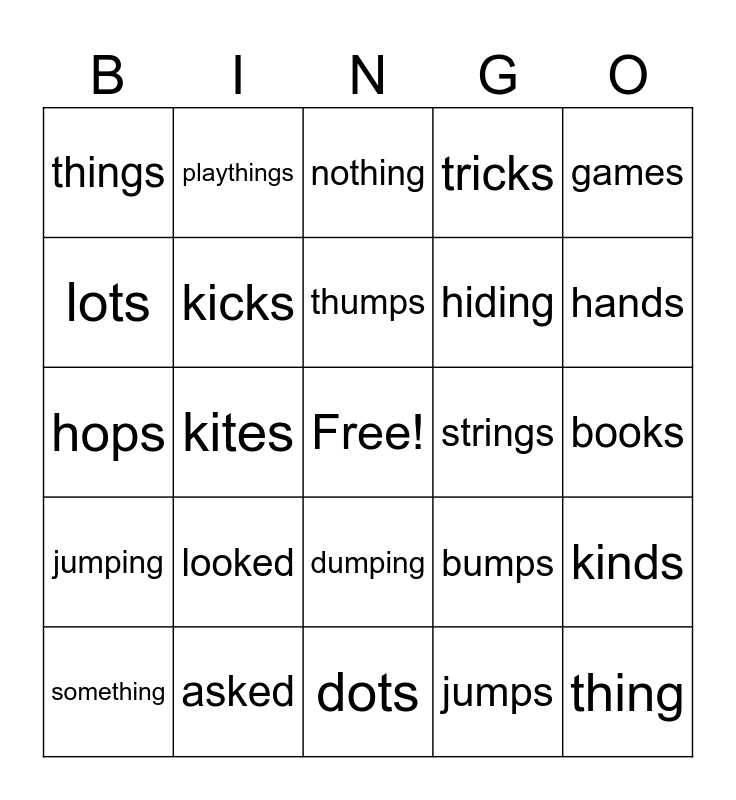 This bingo card has a free space and 24 words: looked, asked, thumps, something, games, things, lots, playthings, strings, dumping, hiding, hops, bumps, kinds, kicks, jumps, books, nothing, hands, kites, thing, jumping, tricks and dots.