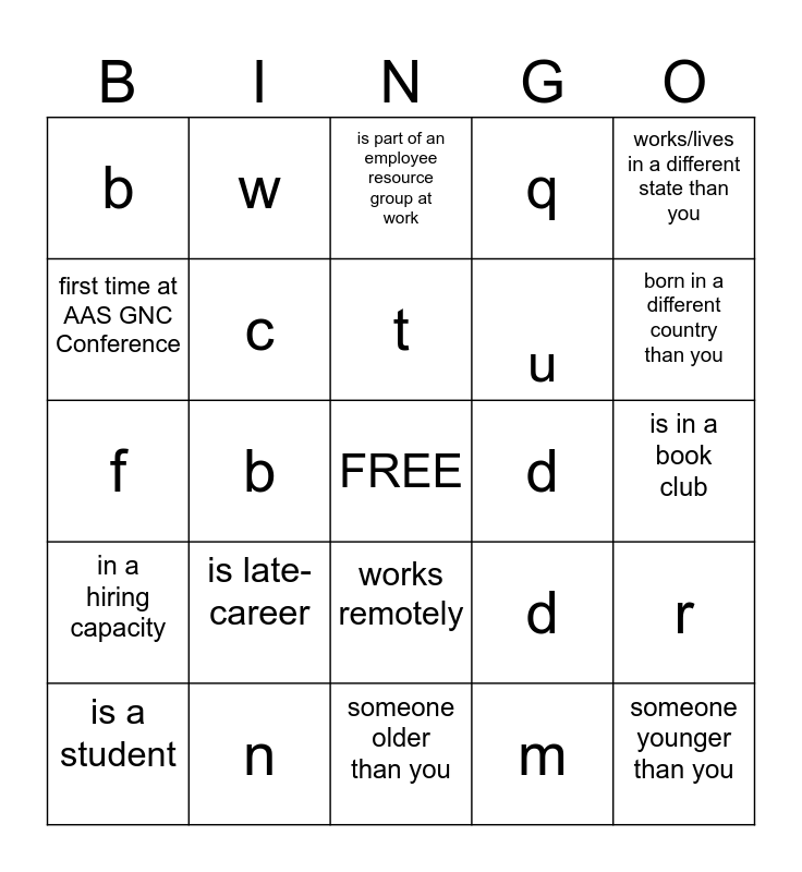 This bingo card has a free space and 29 words: is a student, a, b, is not skiing or snowboarding this weekend, b, is part of an employee resource group at work, c, is late-career, d, n, is in a book club, someone younger than you, someone older than you, m, born in a different country than you, r, works remotely, in a hiring capacity, works/lives in a different state than you, f, d, r, u, first time at AAS GNC Conference, q, w, r, t and u.