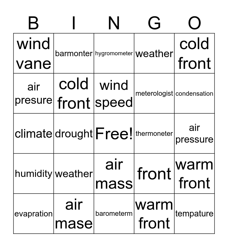 This bingo card has a free space and 24 words: weather, air mase, wind speed, evapration, cold front, wind vane, air presure, barmonter, thermoneter, air mass, meterologist, climate, front, warm front, cold front, warm front, air pressure, hygromometer, condensation, drought, tempature, humidity, weather and barometerm.