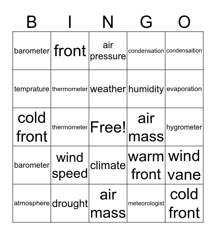 This bingo card has a free space and 24 words: wind speed, drought, weather, atmosphere, condensaition, barometer, temprature, front, air mass, climate, humidity, cold front, warm front, wind vane, thermometer, meteorologist, hygrometer, air pressure, evaporation, thermometer, cold front, barometer, condensation and air mass.