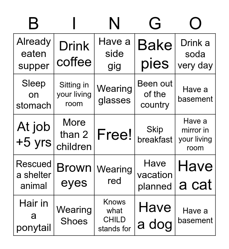 This bingo card has a free space and 24 words: Brown eyes, Wearing Shoes, Wearing glasses, Hair in a ponytail, Drink a soda very day, Already eaten supper, Sleep on stomach, Drink coffee, Skip breakfast, Wearing red, Been out of the country, At job +5 yrs, Have vacation planned, Have a cat, Sitting in your living room, Have a dog, Have a mirror in your living room, Have a side gig, Have a basement, More than 2 children, Have a basement, Rescued a shelter animal, Bake pies and Knows what CHILD stands for.
