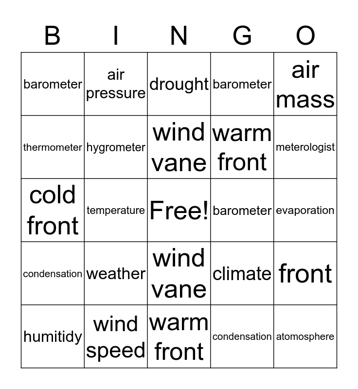 This bingo card has a free space and 24 words: weather, wind speed, wind vane, humitidy, air mass, barometer, thermometer, air pressure, barometer, wind vane, warm front, cold front, climate, front, hygrometer, condensation, evaporation, drought, meterologist, temperature, atomosphere, condensation, barometer and warm front.