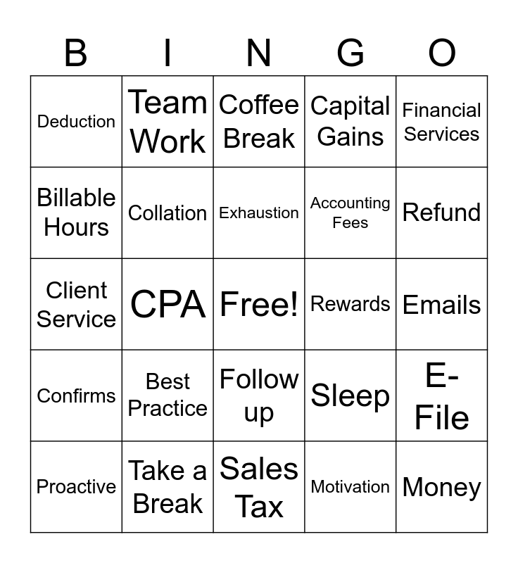This bingo card has a free space and 32 words: Motivation, Cooperation, CPA, Tax Returns, Confirms, Collation, Financial Services, E-File, Team Work, Collaboration, Exhaustion, Coffee Break, Communicate, Incentive, Rewards, Teams Call, Proactive, Client Service, Follow up, Best Practice, Sleep, Healthy, Emails, Take a Break, Money, Capital Gains, Accounting Fees, Billable Hours, Deduction, Sales Tax, IRS and Refund.
