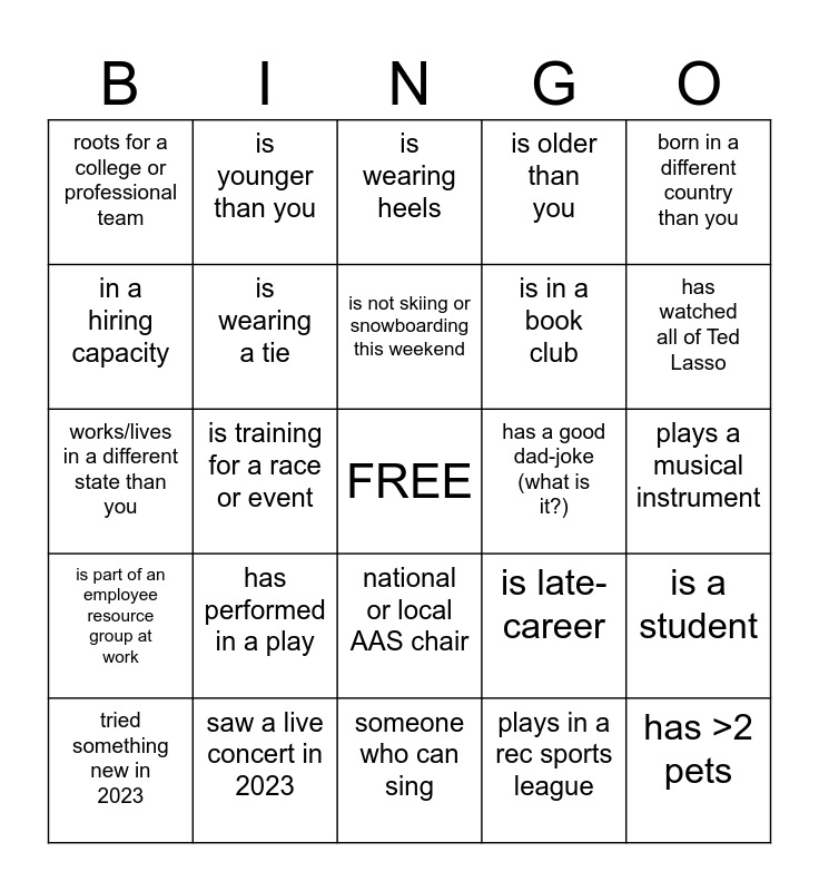 This bingo card has a free space and 29 words: tried something new in 2023, is fluent in a second language, is training for a race or event, takes their coffee different than you, roots for a college or professional team, is wearing heels, is wearing a tie, has performed in a play, has a good dad-joke (what is it?), saw a live concert in 2023, plays a musical instrument, has >2 pets, someone who can sing, plays in a rec sports league, has watched all of Ted Lasso, has different hair color than you, national or local AAS chair, is part of an employee resource group at work, born in a different country than you, works/lives in a different state than you, is late-career, first time at AAS GNC Conference, is in a book club, in a hiring capacity, is older than you, is younger than you, is a student, is not skiing or snowboarding this weekend and works remotely.