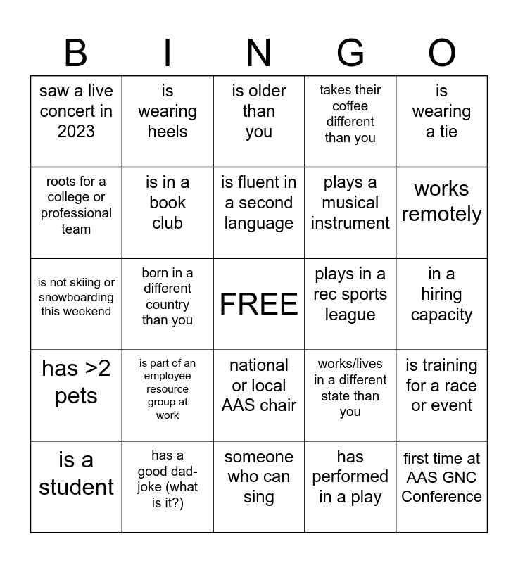 This bingo card has a free space and 29 words: is a student, is younger than you, born in a different country than you, has watched all of Ted Lasso, saw a live concert in 2023, is older than you, is in a book club, is part of an employee resource group at work, plays in a rec sports league, has a good dad-joke (what is it?), in a hiring capacity, first time at AAS GNC Conference, someone who can sing, has performed in a play, works remotely, is late-career, national or local AAS chair, has >2 pets, is wearing a tie, is not skiing or snowboarding this weekend, works/lives in a different state than you, has different hair color than you, plays a musical instrument, roots for a college or professional team, takes their coffee different than you, is wearing heels, is training for a race or event, is fluent in a second language and tried something new in 2023.