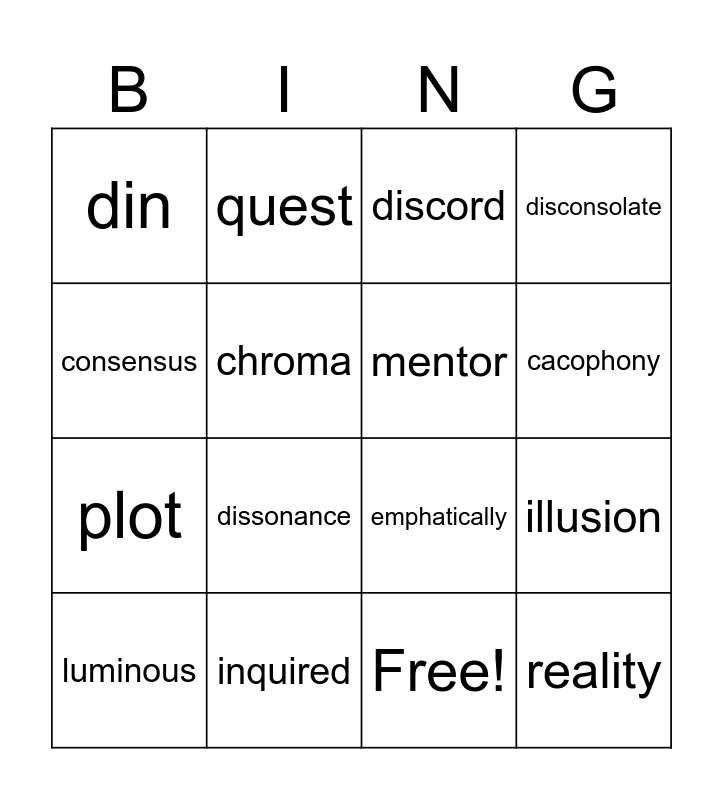 This bingo card has 17 words: Free!, luminous, discord, din, dissonance, disconsolate, illusion, mentor, cacophony, chroma, inquired, emphatically, consensus, quest, plot, point of view and reality.