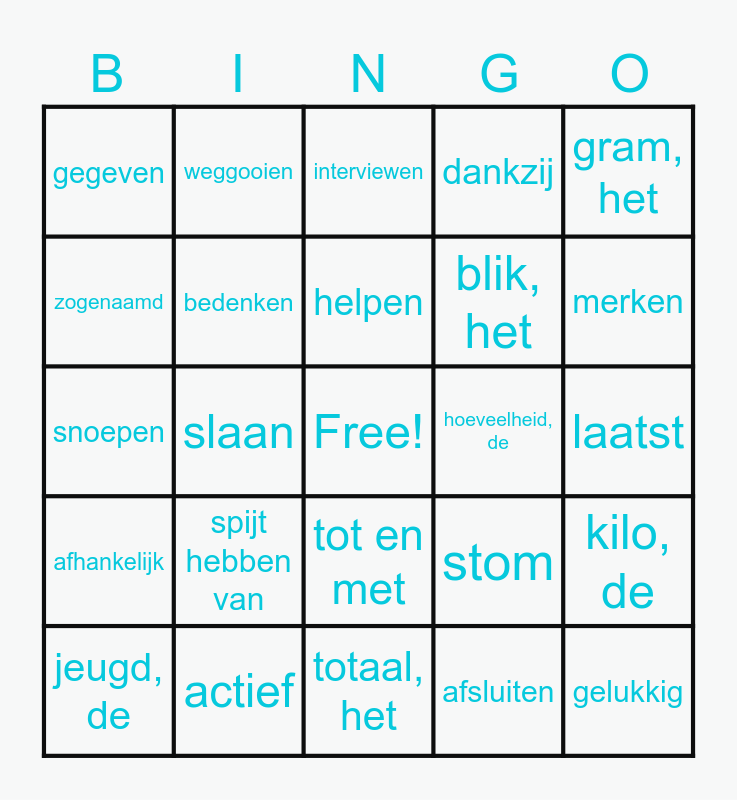 This bingo card has a free space and 58 words: achteraf, actief, afgelopen, afhankelijk, afsluiten, afwas, de, bedenken, beseffen, blik, het, daarom, dankzij, discussiëren, dom, echter, gedrag, het, gegeven, gelukkig, gram, het, helaas, helpen, hoeveelheid, de, interviewen, jeugd, de, kilo, de, kosten, laatst, leeftijd, de, mentor, de, merken, mogelijk, onbekend, ontdekken, overal, personeel, het, pond, het, roken, schrikken, slaan, snoepen, spanning, de, spijt hebben van, stoep, de, stom, stoplicht, het, strafwerk, het, streng, sturen, tot en met, totaal, het, verantwoordelijk, verschrikkelijk, vertellen, volgend, wachtwoord, het, weggooien, werkstraf, de, zogenaamd and zwerfafval, het.