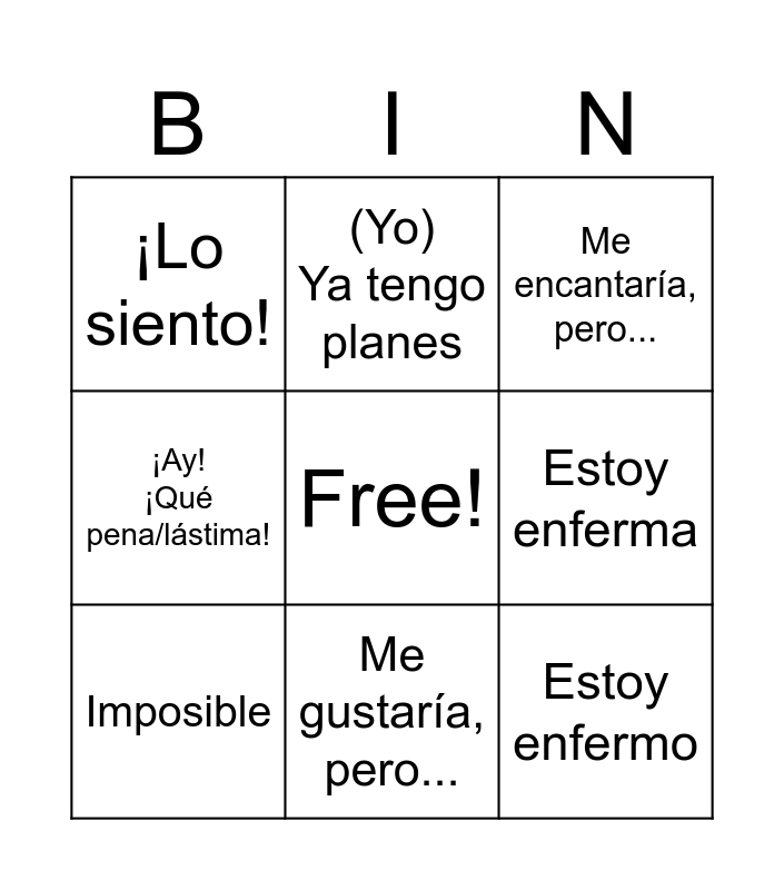 This bingo card has a free space and 12 words: Estoy ocupado, Estoy ocupada, Estoy enfermo, Estoy enferma, (Yo) Ya tengo planes, Me encantaría, pero..., Me gustaría, pero..., No puedo, tengo que..., ¡Lo siento!, ¡Ay! ¡Qué pena/lástima!, Imposible and Quizás otro día.