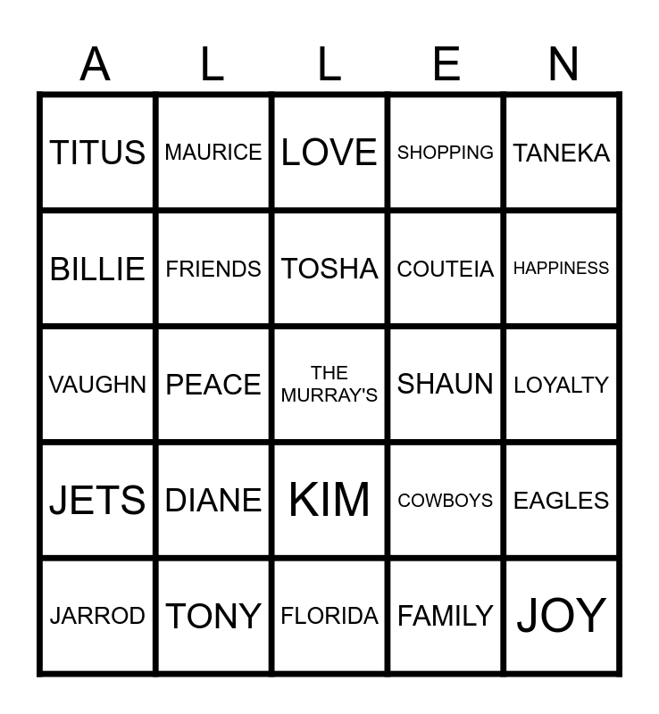 This bingo card has a free space and 24 words: DIANE, TONY, TOSHA, JARROD, TANEKA, TITUS, BILLIE, MAURICE, SHAUN, KIM, COUTEIA, VAUGHN, COWBOYS, EAGLES, FRIENDS, FAMILY, LOYALTY, LOVE, HAPPINESS, PEACE, JOY, JETS, SHOPPING and FLORIDA.