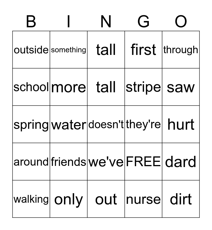 This bingo card has 25 words: friends, out, tall, walking, through, outside, school, something, they're, we've, stripe, spring, FREE, dard, more, dirt, hurt, tall, saw, water, doesn't, only, around, first and nurse.