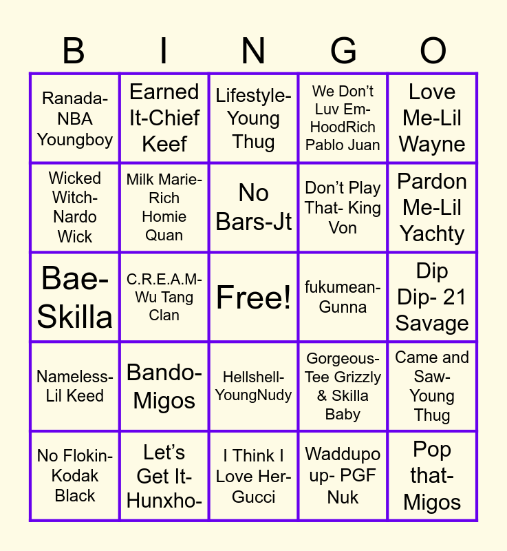 This bingo card has a free space and 34 words: Blah Blah Blah- Rich Homie Quan, Waddupo up- PGF Nuk, Maybach-42 Dugg, Bad and Boujie-Migos, Nameless- Lil Keed, Milk Marie- Rich Homie Quan, Love Me-Lil Wayne, No Flokin- Kodak Black, Earned It-Chief Keef, Top Off-Gunna, No Bars-Jt, Lifestyle-Young Thug, Let’s Go-Key Glock, HIM- Big Yago, fukumean-Gunna, Pardon Me-Lil Yachty, Let’s Get It-Hunxho-, Bae- Skilla, Bando- Migos, Gorgeous- Tee Grizzly & Skilla Baby, Hellshell- YoungNudy, O Let’s Do It- Waka Flocka Flame, Ranada- NBA Youngboy, Dip Dip- 21 Savage, I Think I Love Her-Gucci, Pop that- Migos, We Don’t Luv Em- HoodRich Pablo Juan, No Auto-Lil Durk, Don’t Play That- King Von, Wicked Witch-Nardo Wick, My Way-Fetty Wap, C.R.E.A.M- Wu Tang Clan, Came and Saw- Young Thug and California Love- Tupac.