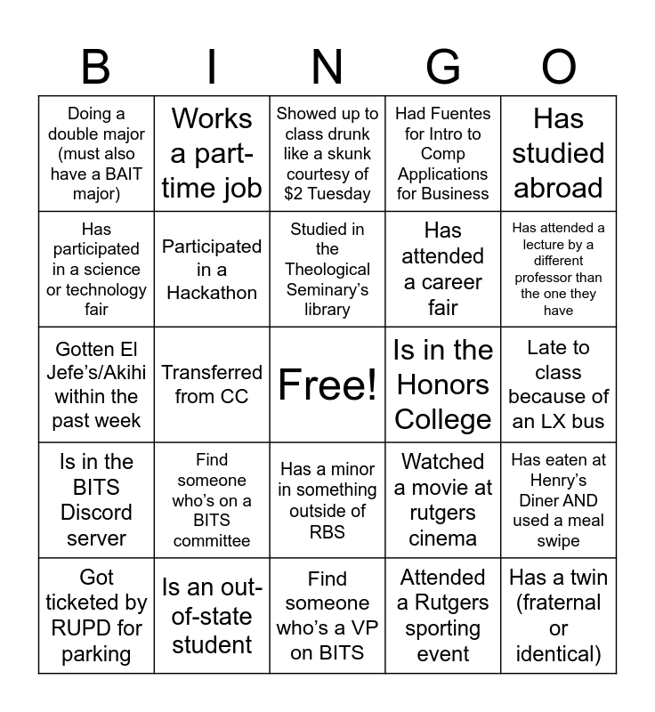 This bingo card has a free space and 50 words: Is a vegetarian, Has a twin (fraternal or identical), Suffered with Pinter in BDAUU, Find someone who’s a VP on BITS, Find someone who’s on a BITS committee, Has green eyes, Works a part-time job, Broken a bone, Has participated in a science or technology fair, Has a LinkedIn profile (this is basically a free space), Participated in a Hackathon, Had Fuentes for Intro to Comp Applications for Business, Has eaten at Henry’s Diner AND used a meal swipe, Watched a movie at rutgers cinema, Meal swiped at the Starbucks Truck, Eaten at Tacoria, Studied in the Theological Seminary’s library, Is in the Honors College, Is a member of DSP/PCT, Has studied abroad, Transferred from CC, Attended a Rutgers sporting event, Doing a double major (must also have a BAIT major), Has attended a career fair, Commuter, Slept in class, Has attended a lecture by a different professor than the one they have, Had an internship during Summer of 2023, Showed up to class drunk like a skunk courtesy of $2 Tuesday, Has a minor in something outside of RBS, Has a minor in something meaningful, Is a part time student this semester, Took managerial accounting at CC, Lives on Cook/Doug, Is an out-of-state student, Has a python programming certification, Has 500+ connections on LinkedIn, Follows bits on instagram, Ate at Brower Commons, Late to class because of an LX bus, Got woken up because of a fire drill, Wears contacts, Took ops management with someone other than Romulo Neves Ely, Was in DECA/FBLA (either hs/college), Got ticketed by RUPD for parking, Gotten El Jefe’s/Akihi within the past week, Waited on the pasta line at Livi Dining Hall, Knows the name of at least 20 internal members of BITS, Is in the BITS Discord server and Gotten on the wrong bus to class.