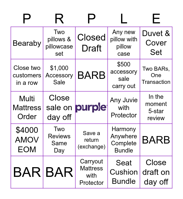 This bingo card has a free space and 24 words: BAR, Two Reviews Same Day, BARB, Seat Cushion Bundle, Duvet & Cover Set, Bearaby, Two pillows & pillowcase set, Closed Draft, Any Juvie with Protector, In the moment 5-star review, Multi Mattress Order, $1,000 Accessory Sale, Harmony Anywhere Complete Bundle, BARB, Close two customers in a row, BAR, Carryout Mattress with Protector, Any new pillow with pillow case, Two BARs, One Transaction, $4000 AMOV EOM, Close sale on day off, Save a return (exchange), $500 accessory sale carry out and Close draft on day off.