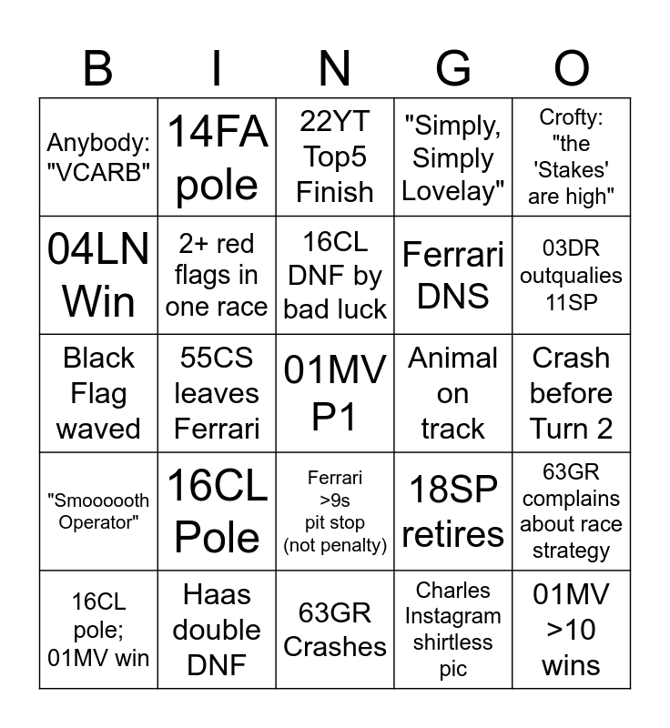 This bingo card has a free space and 24 words: 16CL Pole, Haas double DNF, 16CL DNF by bad luck, 16CL pole; 01MV win, Crofty: "the 'Stakes' are high", Anybody: "VCARB", 04LN Win, 14FA pole, Animal on track, Ferrari >9s pit stop (not penalty), Ferrari DNS, Black Flag waved, 18SP retires, 63GR complains about race strategy, 2+ red flags in one race, Charles Instagram shirtless pic, Crash before Turn 2, 22YT Top5 Finish, 03DR outqualies 11SP, 55CS leaves Ferrari, 01MV >10 wins, "Smoooooth Operator", "Simply, Simply Lovelay" and 63GR Crashes.