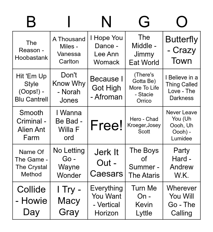 This bingo card has a free space and 75 words: It Feels So Good - Sonique, Absolutely (Story of a Girl) - Nine Days, I Hope You Dance - Lee Ann Womack, Gotta Tell You - Samantha Mumba, Teenage Dirtbag - Wheatus, Lady - Hear Me Tonight - Modjo, Who Let The Dogs Out - Baha Men, He Loves You Not - Dream, Right Now - SR-71, Never Had A Dream Come True - S Club, Who I Am - Jessica Andrews, What Would You Do? - City High, Because I Got High - Afroman, Hit 'Em Up Style (Oops!) - Blu Cantrell, Flavor Of The Weak - American Hi-Fi, I Wanna Be Bad - Willa Ford, Mad World - Gary Jules, Wherever You Will Go - The Calling, I Do!! - Toya, Butterfly - Crazy Town, Heaven - DJ Sammy, Smooth Criminal - Alien Ant Farm, Don't Know Why - Norah Jones, A Thousand Miles - Vanessa Carlton, The Middle - Jimmy Eat World, Still Fly - Big Tymers, Move Your Feet - Junior Senior, Headstrong - Trapt, Days Go By - Dirty Vegas, All The Things She Said - t.A.T.u., CALIFORNIA - Phantom Planet, The Ketchup Song (Aserejé) - Las Ketchup, Never Scared - Bone Crusher, The Boys of Summer - The Ataris, I Believe in a Thing Called Love - The Darkness, (There's Gotta Be) More To Life - Stacie Orrico, Stacy's Mom - Fountains Of Wayne, Are You Gonna Be My Girl - Jet, Never Leave You (Uh Oooh, Uh Oooh) - Lumidee, Turn Me On - Kevin Lyttle, Heaven - Los Lonely Boys, Move Ya Body - Nina Sky, Tipsy - Radio Mix - J-Kwon, On the Way Down - Ryan Cabrera, Ocean Avenue - Yellowcard, Take Me Out - Franz Ferdinand, Collide - Howie Day, The Reason - Hoobastank, Lean Back - Edit - Terror Squad, I Don't Wanna Know - Mario Winans, 1985 - Bowling For Soup, Jerk It Out - Caesars, Aaron's Party (Come Get It) - Aaron Carter, Back Here - BBMAK, Ugly - The Exies, Pieces Of Me - Ashlee Simpson, Slow Hands - Interpol, I Can Only Imagine - MercyMe, Do You Call My Name - Ra, Take It Off - The Donnas, No Letting Go - Wayne Wonder, Bridge Over Troubled Water - Clay Aiken, Pump It Up - Joe Budden, Scandalous - Mis-Teeq, Superman (It's Not Easy) - Five For Fighting, Hero - Chad Kroeger,Josey Scott, Get Over It - OK Go, Starry Eyed Surprise - Paul Oakenfold, Hate To Say I Told You So - The Hives, Party Hard - Andrew W.K., Name Of The Game - The Crystal Method, I Try - Macy Gray, Sandstorm - Darude, Everything You Want - Vertical Horizon and Babylon - David Gray.