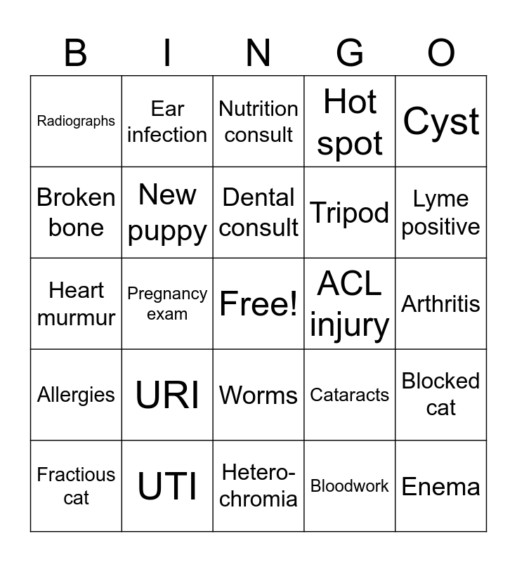 This bingo card has a free space and 24 words: URI, UTI, Dental consult, Fractious cat, Cyst, Radiographs, Broken bone, Ear infection, ACL injury, Worms, Tripod, Heart murmur, Cataracts, Blocked cat, New puppy, Bloodwork, Arthritis, Nutrition consult, Lyme positive, Pregnancy exam, Enema, Allergies, Hot spot and Hetero-chromia.