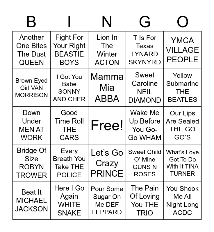 This bingo card has a free space and 54 words: Ain’t Life a Brook FERRON, Every Breath You Take THE POLICE, Is There Life Out There REBA MCENTIRE, Something To Live For BARNEY BENTAL, Walk This Way AEROSMITH, American Pie STEWART MCLEAN, Fight For Your Right BEASTIE BOYS, Jailhouse Rock ELVIS PRESLEY, Sweet Caroline NEIL DIAMOND, Walk The Line JOHNNY CASH, Another One Bites The Dust QUEEN, Girls Just Want To Have Fun CYNDI LAUPER, Let’s Go Crazy PRINCE, Sweet Child O’ Mine GUNS N ROSES, Walking On Sunshine KATRINA & THE WAVES, Beat It MICHAEL JACKSON, Good Time Roll THE CARS, Lion In The Winter ACTON, Sweet Dreams Are Made Of This EURYTHMICS, What’s Love Got To Do With It TINA TURNER, Bridge Of Size ROBYN TROWER, Here I Go Again WHITE SNAKE, Mamma Mia ABBA, T Is For Texas LYNARD SKYNYRD, What’s Your Mama’s Name TANYA TUCKER, Brown Eyed Girl VAN MORRISON, Highway Of Love ARETHA FRANKLIN, New Sensation INXS, Take On Me A-HA, With Or Without You U2, Call Me BLONDIE, Hungry Like The Wolf DURAN DURAN, Old Man NEIL YOUNG, Thank God I’m A Country Boy JOHN DENVER, YMCA VILLAGE PEOPLE, Copperhead Road STEVE EARL, I Got You Babe SONNY AND CHER, Pour Some Sugar On Me DEF LEPPARD, The Pain Of Loving You THE TRIO, Yellow Submarine THE BEATLES, Crimson And Clover THE RONDELLES, I Love Rock N Roll JOAN JETT, Rock And Roll LED ZEPPLIN, Total Eclipse Of The Heart BONNIE TYLER, You Shook Me All Night Long ACDC, Do You Really Want To Hurt Me BOY GEORGE, I Wanna Dance With Somebody WHITNEY HOUSTON, Run Through The Jungle CCR, Wake Me Up Before You Go-Go WHAM, Our Lips Are Sealed THE GO GO’S, Down Under MEN AT WORK, I’ve Had The Time Of My Life BILLE MEDLEY & JENNIFER WARNES, Sharp Dressed Man ZZ TOP and Walk Like An Egyptian THE BANGLES.