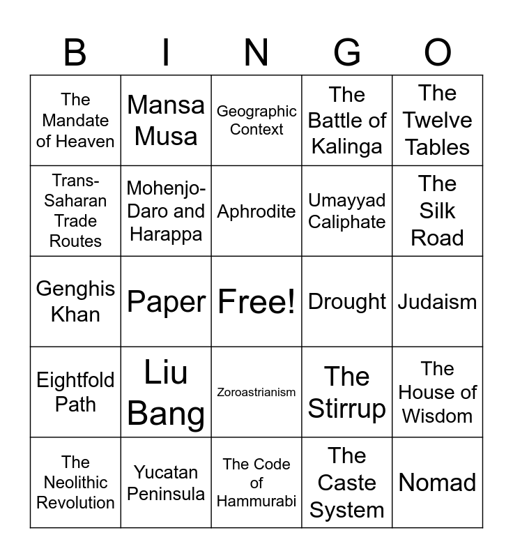 This bingo card has a free space and 44 words: Polytheism, Nomad, Shi Huangdi, The Neolithic Revolution, Mediterranean Sea, The Caste System, Geographic Context, Direct democracy, The Twelve Tables, Yucatan Peninsula, The Battle of Kalinga, Drought, Zoroastrianism, Liu Bang, The Peloponnesian War, The Code of Hammurabi, Cultural diffusion, Genghis Khan, Constantine, The Silk Road, Mansa Musa, Confucianism, Historical Circumstances, The Mandate of Heaven, Cuneiform, Judaism, Islam, The Gupta Empire, The Stirrup, Eightfold Path, The Compass, The House of Wisdom, Christianity, Monsoons, Paper, The Royal Road, Gunpowder, The Himalayan Mountains, Aphrodite, Trans-Saharan Trade Routes, Umayyad Caliphate, Alexander of Macedon, Mohenjo-Daro and Harappa and Mesopotamia.
