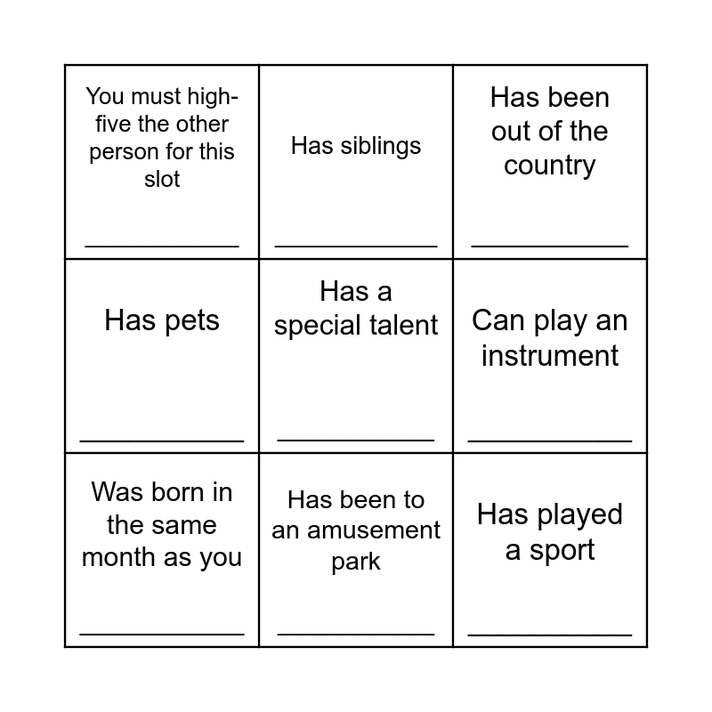This bingo card has 9 words: Was born in the same month as you ___________, Has been out of the country __________, Has siblings ____________, Has pets __________, You must high-five the other person for this slot ____________, Can play an instrument __________, Has a special talent __________, Has played a sport __________ and Has been to an amusement park ___________.
