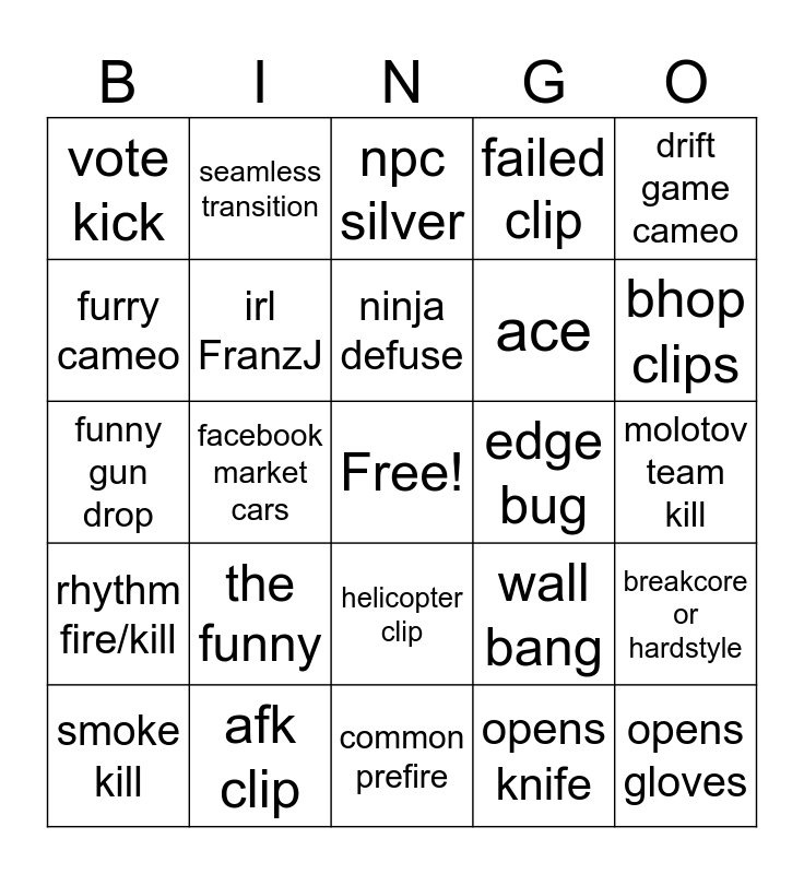 This bingo card has a free space and 24 words: the funny, afk clip, ninja defuse, smoke kill, drift game cameo, vote kick, furry cameo, seamless transition, edge bug, helicopter clip, ace, funny gun drop, wall bang, breakcore or hardstyle, irl FranzJ, opens knife, molotov team kill, npc silver, bhop clips, facebook market cars, opens gloves, rhythm fire/kill, failed clip and common prefire.